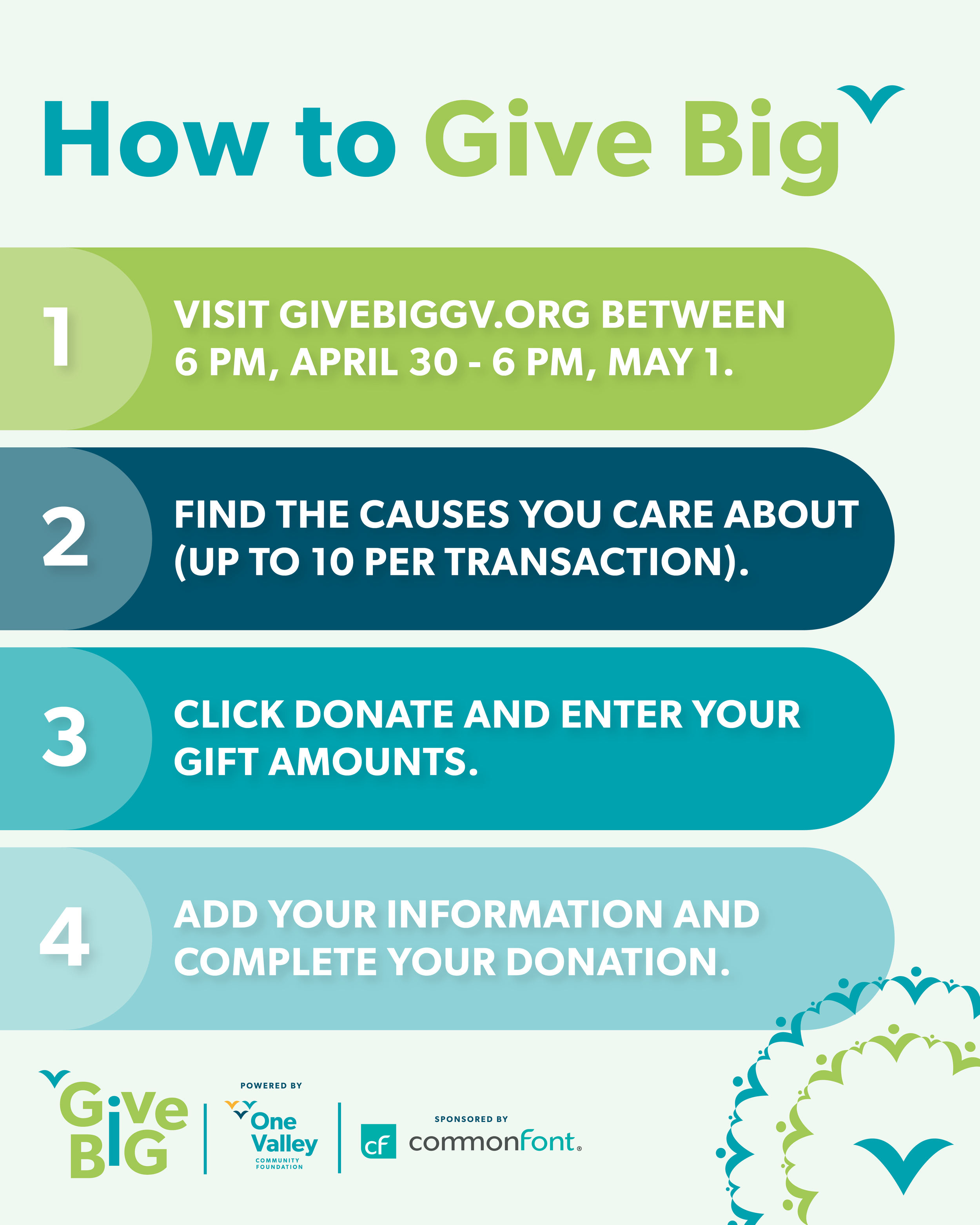 On April 30-May 1, visit givebiggv.org and make a donation to us and/or to any of the great participating nonprofit organizations in your community. All giving will end at 6 PM on May 1st, so make sure to get your gift in on time!